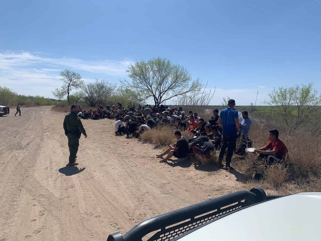 Ricardo Bueno | Eagle Pass, Pass, Tx.- Agentes de la Patrulla Fronteriza de EE. UU. asignados a la Estación Sur de Eagle Pass del Sector Del Rio se encontraron con un gran grupo de inmigrantes indocumentados después de que ingresaron ilegalmente a los Estados Unidos cerca de Rosetta Orchards en Eagle Pass, el 27 de marzo.