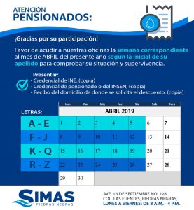 Amanda Morales | Piedras Negras, Coah.- SIMAS invita a los usuarios pensionados y jubilados a que pasen a sus oficinas, en este mes de abril, para comprobar supervivencia en el orden establecido según la inicial de su primer apellido.