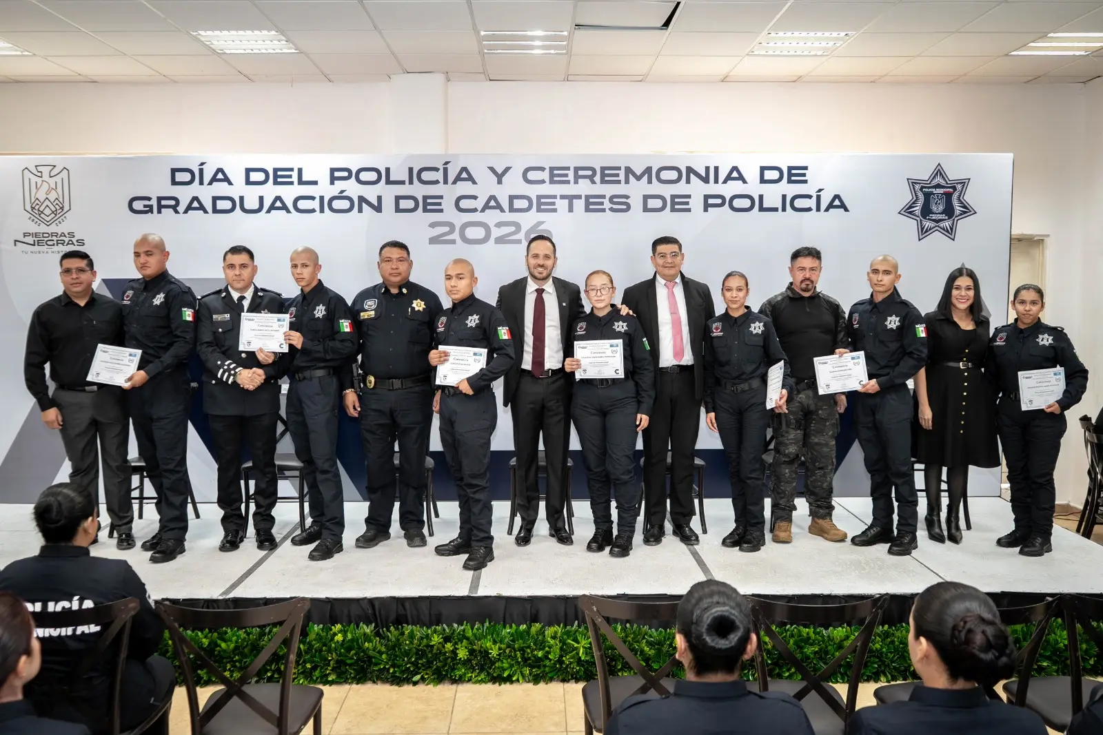 Al iniciar el segundo año del Gobierno de la Nueva Historia, el Presidente Municipal reitero el seguir respaldando a las y los policías de Piedras Negras, fortaleciendo a la corporación mediante mejores condiciones laborales, equipamiento adecuado, capacitación permanente y una política firme de dignificación policial, con el objetivo de convertir a la ciudad en la más segura del país.