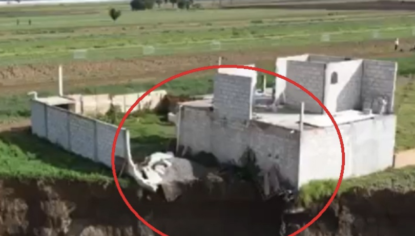 Parte de la barda trasera de la vivienda de la familia Sánchez ya fue tragada por el socavón en Santa María Zacatepec, en el municipio de Juan C. Bonilla, ocurrió esta mañana alrededor de las 7:50 horas, luego de que se presentará un nuevo desprendimiento.