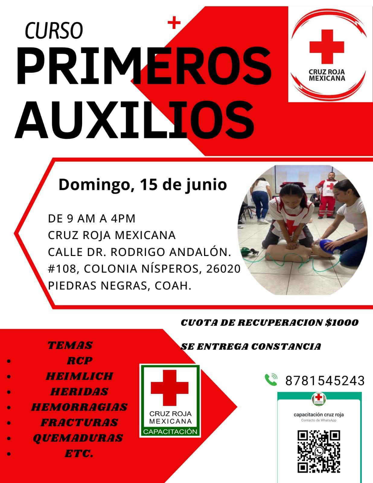 Piedras Negras, Coahuila.- Este próximo 15 de junio, Cruz Roja estará llevando a cabo su curso de Primeros Auxilios, el cual es de los más solicitados en la institución, pues al finalizar se entrega una certificación a los participantes, informó Jesús Arreola, jefe de Socorros.