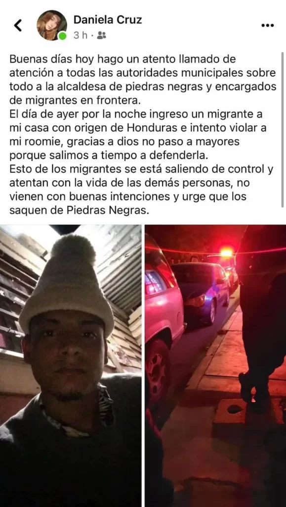 Julio Fernández | Piedras Negras, Coah.- A través de redes sociales circula la publicación de una internauta, donde señala que un migrante originario de Honduras, ingresó a su domicilio para tratar de abusar sexualmente de la amiga con quien quien vive.