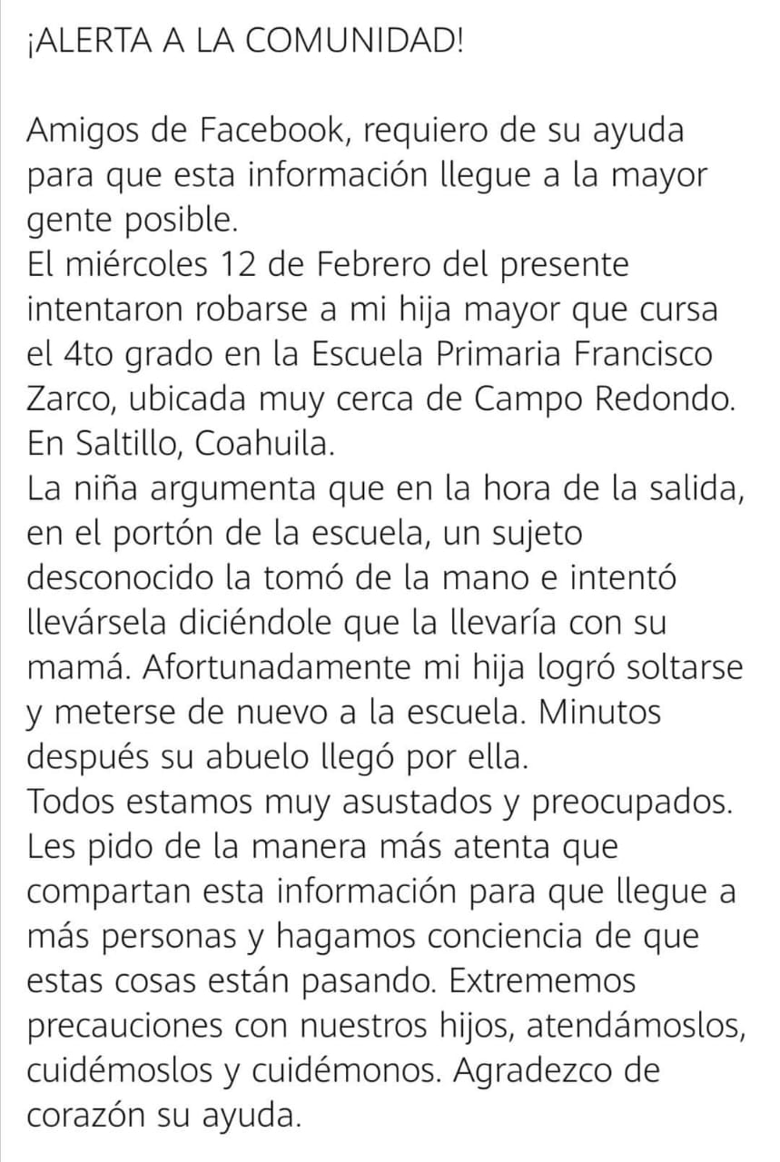 Redacción | Saltillo, Coah.- A traves de redes sociales un padre de familia alertó sobre el intento de robo de su hija de la escuela primaria Federal Francisco Zarco.