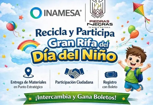 Daniel Herrera GMN | Piedras Negras, Coahuila; 28 de abril de 2026. — El Municipio, en coordinación con la empresa INAMESA, lanzó una convocatoria dirigida a niñas y niños para participar en una dinámica de reciclaje con motivo del Día del Niño, la cual contempla la recolección de materiales valorizables a cambio de boletos para una rifa.