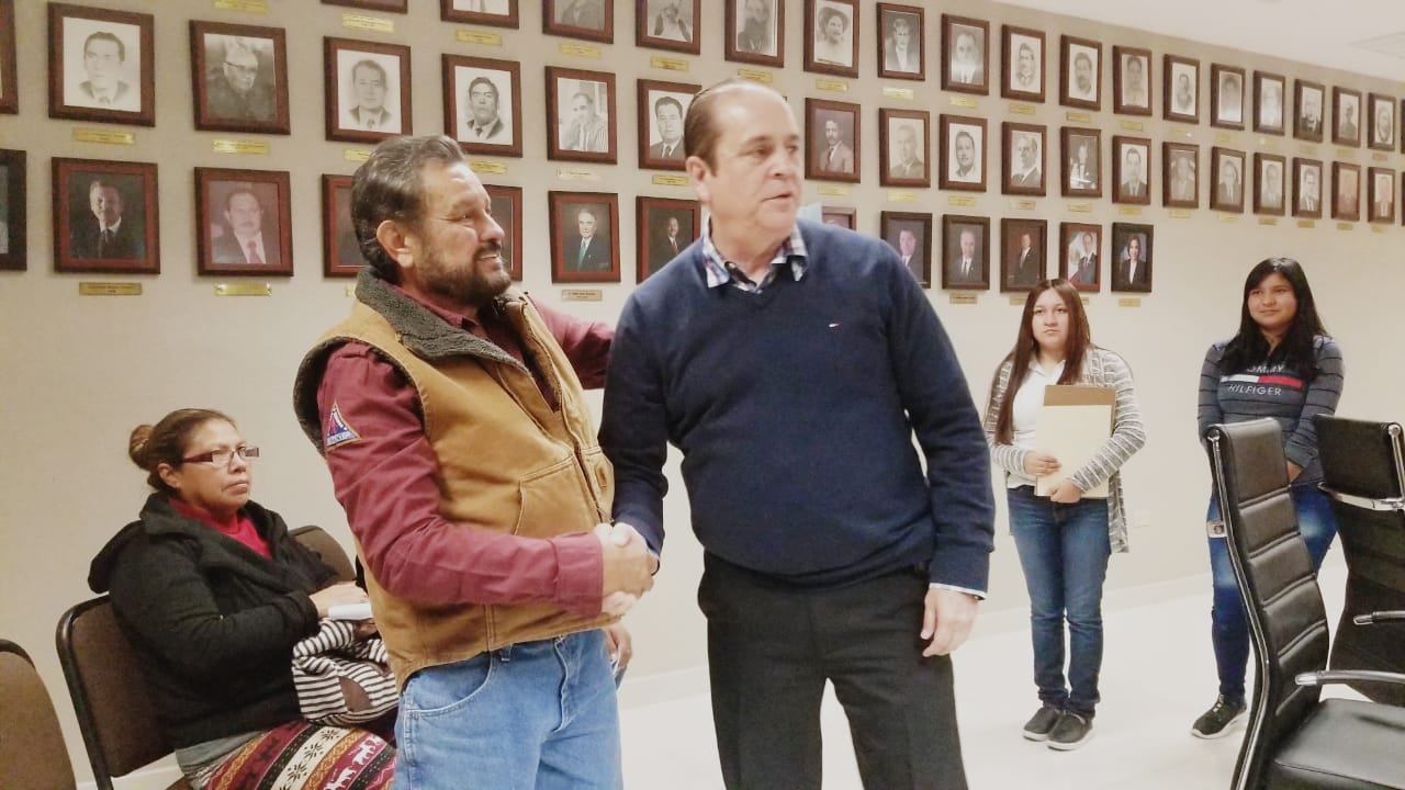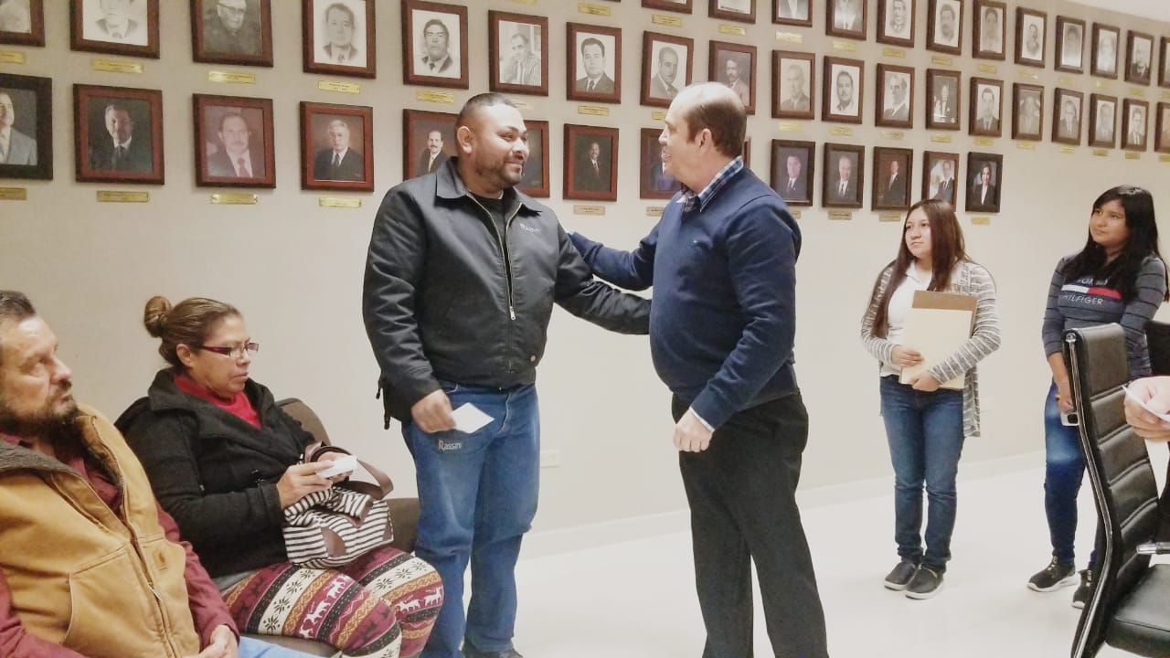 Lucía Carrillo | Piedras Negras, Coah.- Esta mañana el alcalde Claudio Bres Garza y el Tesorero Municipal Sebastián Guerra Ávila hicieron la entrega de cuatro cheques correspondientes al pago de Seguro contra desastres naturales.