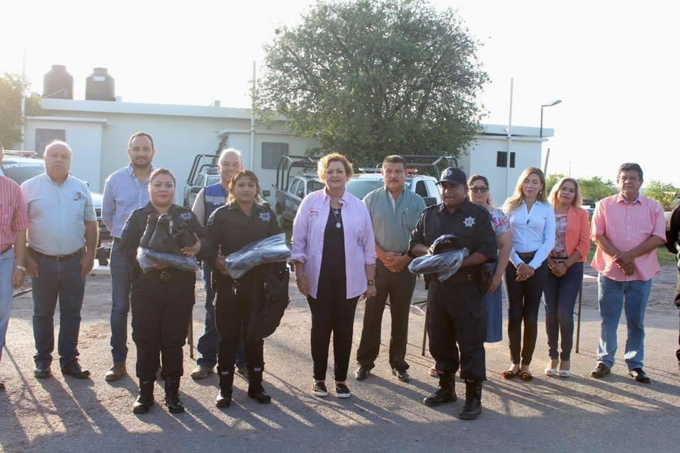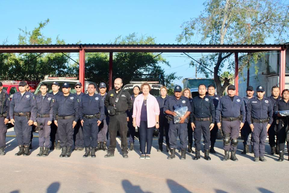 Con la presencia de regidores, funcionarios municipales y el mando único policial, Lic. Carlos Ortiz Salazar, la alcaldesa hizo entrega de uniformes, dos pares de calzado táctico, así como chalecos balísticos, cascos y se les dotó de municiones para las armas de cargo que utilizan los policías.
