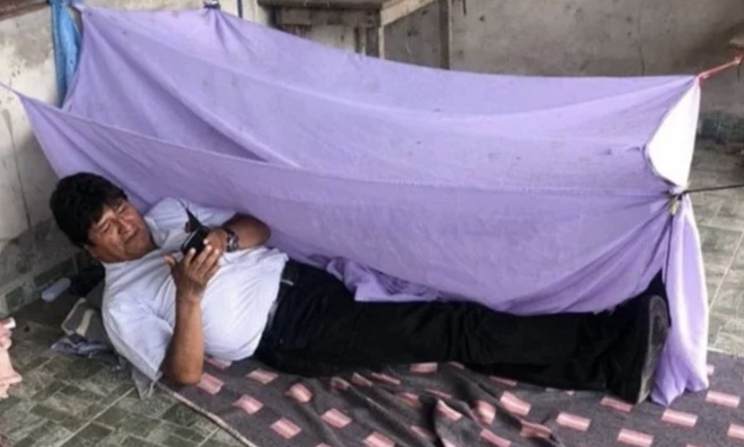Redacción.- Horas después de renunciar a la presidencia de Bolivia y antes de partir hacia México, Evo Morales publicó en Twitter una foto donde se le ve acostado en el suelo sobre una manta y con unas sábanas a modo de improvisada carpa.