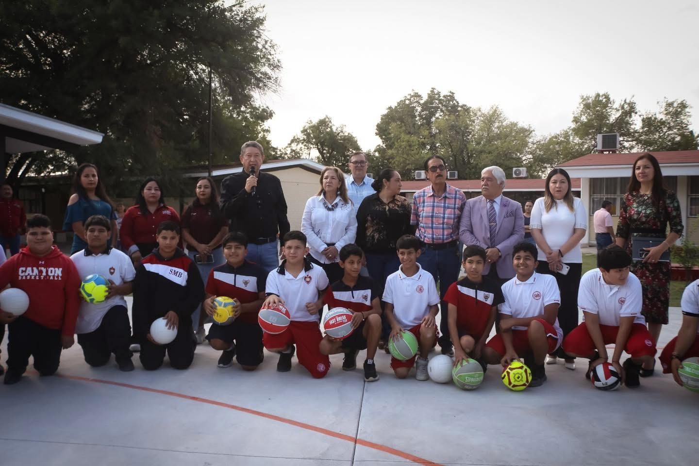 Allende, Coahuila.- El alcalde Ing. Ricardo Treviño Guevara, junto a su esposa Profra. María del Refugio Saldívar de Treviño, presidenta honoraria del DIF Allende, inauguró la rehabilitación de la cancha de la Secundaria “Marcos Benavides”, que ahora cuenta con porterías, tableros y baños renovados, además de la entrega de 15 balones a los estudiantes.