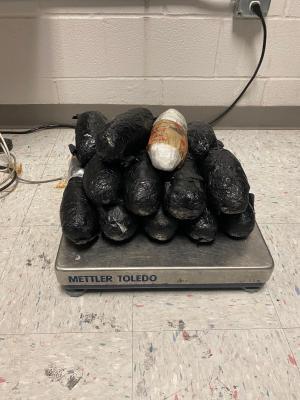 El vehículo fue seleccionado para inspección después de que un agente canino K9 alertó sobre la posible presencia de narcóticos. Después de realizar una inspección física, los oficiales descubrieron 20 paquetes ocultos dentro del vehículo. Los paquetes contenían 23 libras (10,6 kg) de supuesta metanfetamina.