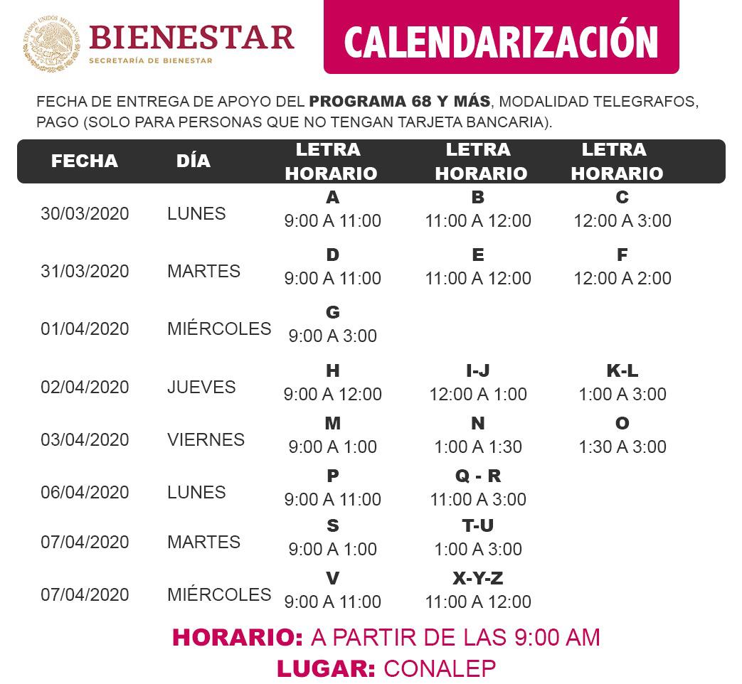 Los días de recepción de pago es del 30 de marzo al 07 de abril a partir de las 9 de la mañana de acuerdo al calendario establecido, presentándose con 2 copias de la credencial de elector o inapam.