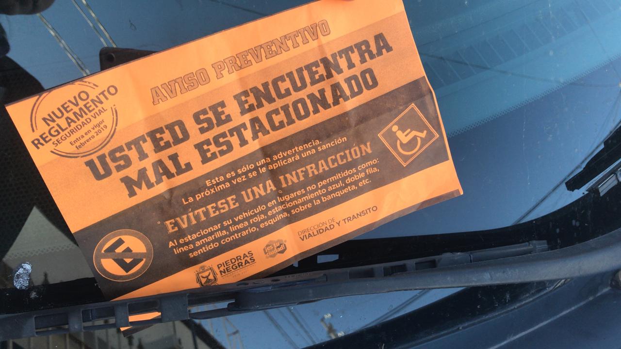 Amanda Morales | Piedras Negras, Coah.- A través de advertencias impresas, la dirección de Vialidad y Tránsito estará difundiendo todo el mes de enero a conductores que hagan mal uso de su vehículo ya sea por estacionarse mal, encima de banquetas, líneas rojas o cualquier otro tipo de irregularidad.