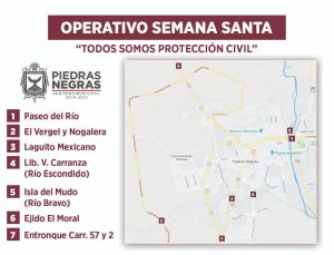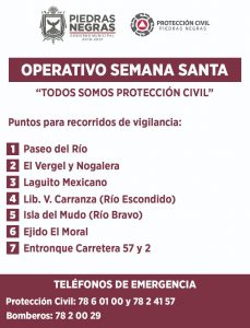 Se realizarán recorridos por los lugares más frecuentados para brindar el apoyo si así lo requirieran turistas y locales, además, los días 18, 19, 20 y 21 de abril se establecerán cuadrillas de seguridad en el: Paseo del Río, El Vergel, La Nogalera, Laguito Mexicano, Río Escondido, Isla del Mudo (Río Bravo), Ejido el Moral, Entroque Carretera 57 y 2.