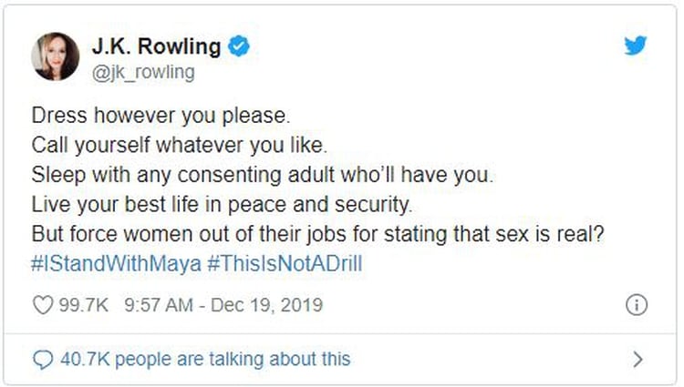 La inglesa de 54 años, guionista y productora de cine, apoyó a Maya Forstater, una mujer que perdió su empleo luego de expresar su inconformidad con la ley que permite elegir libremente la identidad sexual en el documento. Básicamente, Forstater fue despedida por twittear que las mujeres transgénero no pueden cambiar su sexo biológico.