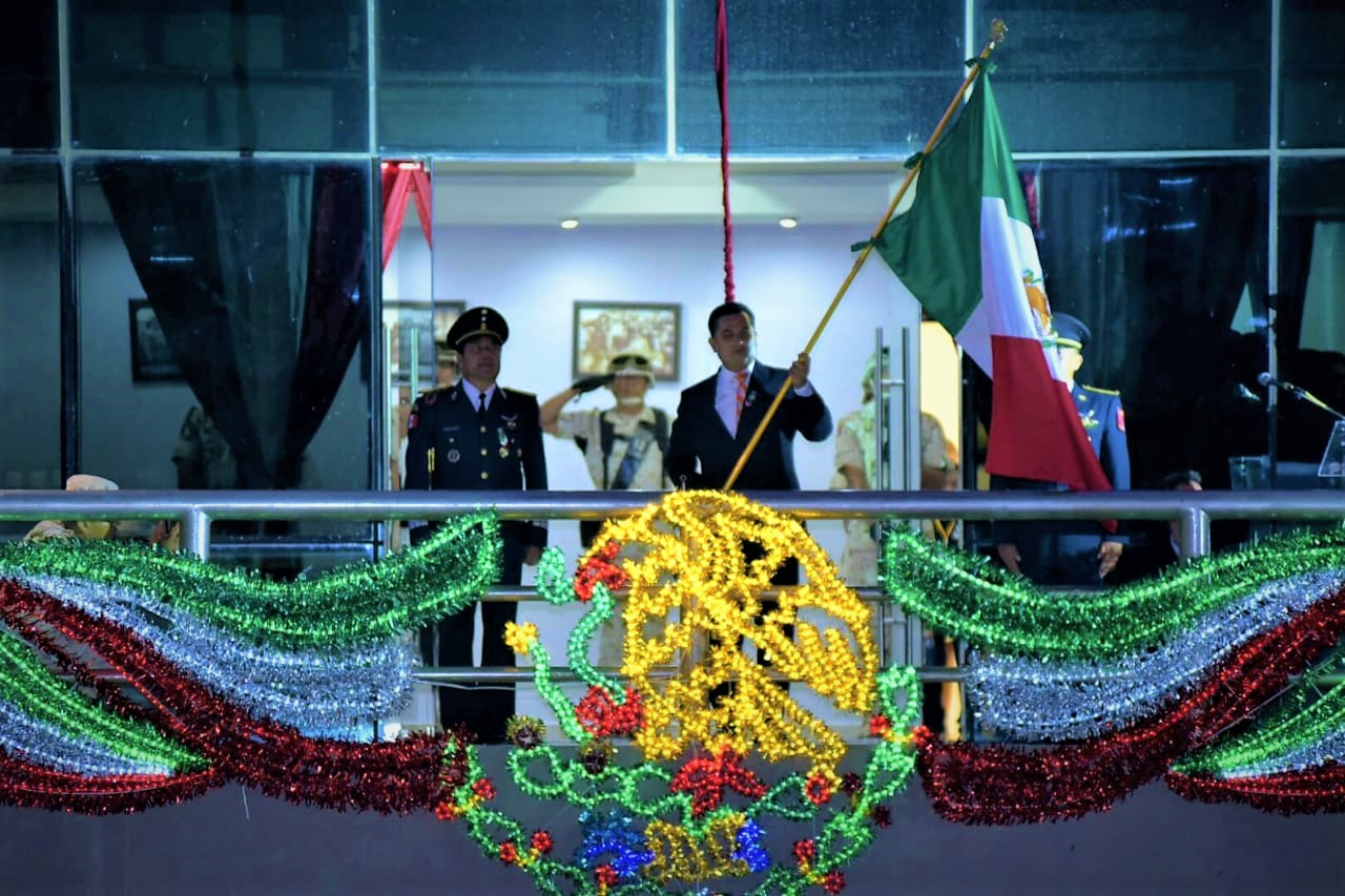 Desde el balcón principal de presidencia municipal autoridades encabezadas por el General Diplomado de Estado Mayor Gilberto Martínez Martínez, el Teniente de Infantería D.E.M. Elver Jiménez Benítez y el Secretario del Ayuntamiento Felipe Basulto Corona, participaron del protocolo del grito de independencia.