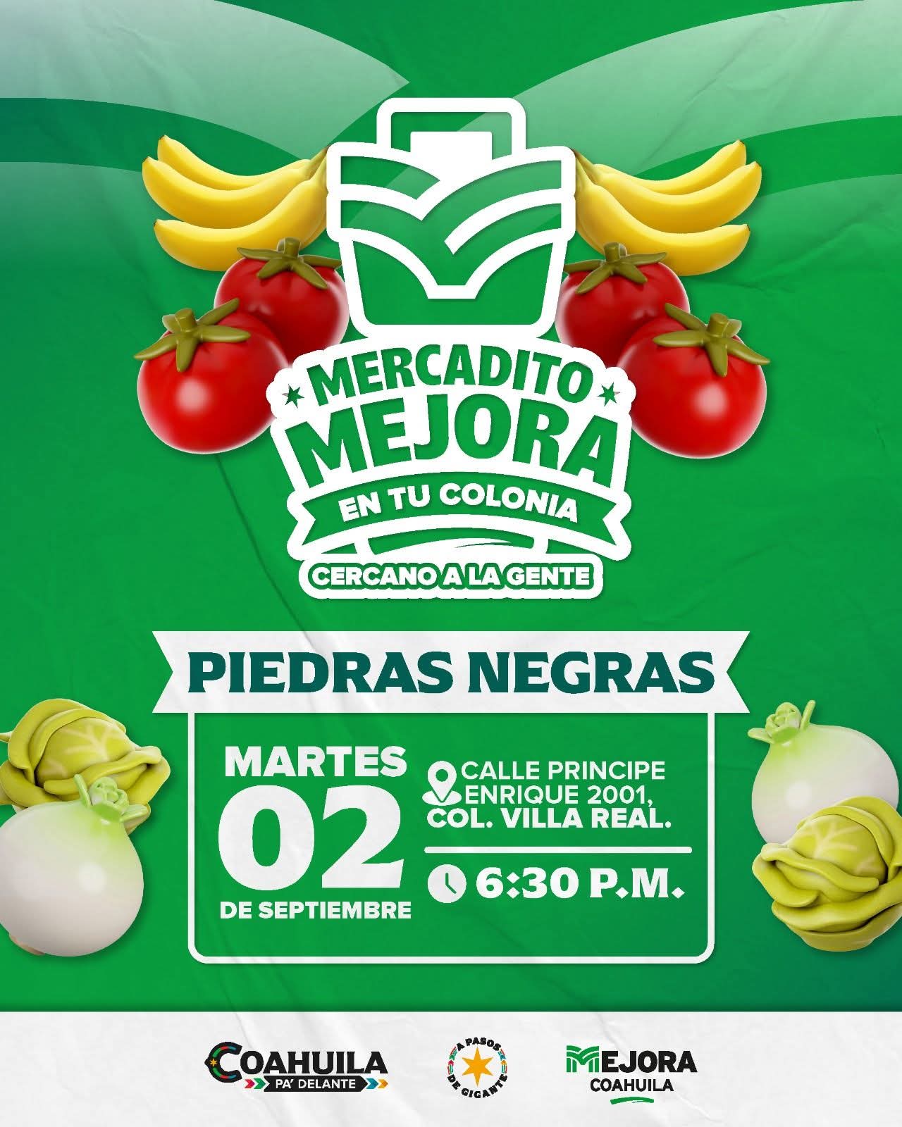 Piedras Negras, Coahuila.- Tal y como se ha vuelto costumbre, este martes se tendrá una nueva edición del programa alimentario Mercadito Mejora, el cual contará como sede con las instalaciones de la escuela secundaria Octavio Chavarría Delgado de la colonia Villarreal.