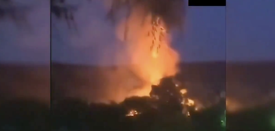 El video muestra llamas naranjas y humo negro subiendo hacia el cielo desde Hyesan, mientras se oyen fuertes sonidos que parecen explosiones. Se ve a unas pocas personas viendo la escena desde el lado chino de la frontera.