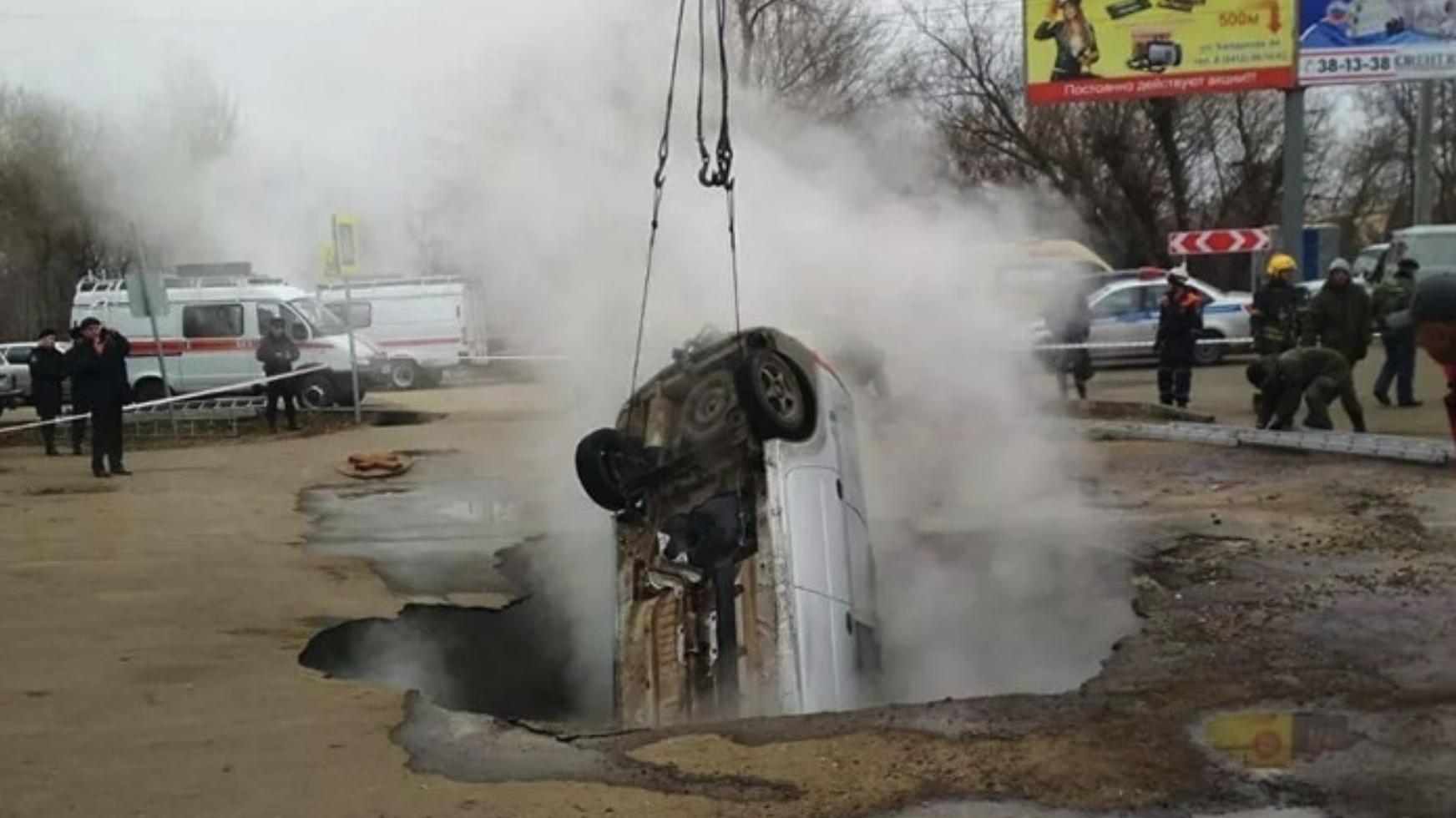 Два человека погибли в Пензе, заживо сварившись в кипятке. Их автомобиль провалился в огромную дыру в асфальте, образовавшуюся прямо под ними. Яма моментально заполнилась горячей водой.