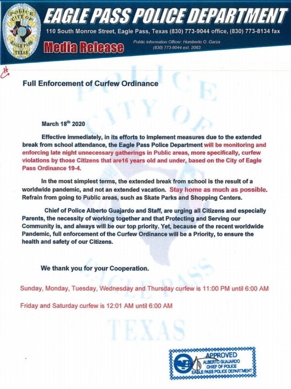 Ricardo Bueno | Piedras Negras, Coah.- El departamento de Policía de Eagle Pass estableció el toque de queda para menores de 16 años, a fin de evitar que estén fuera de sus casas en horas innecesarias ante la contingencia por el coronavirus.