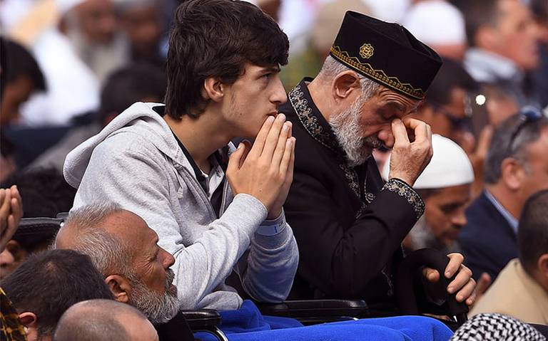 Alrededor de 20 mil de personas, muchas de ellas con hiyab, se reunieron en el Hagley Park, frente a la mezquita de Al Noor, donde fueron acribilladas 42 personas, para observar el llamado musulmán a la oración en memoria de las víctimas.