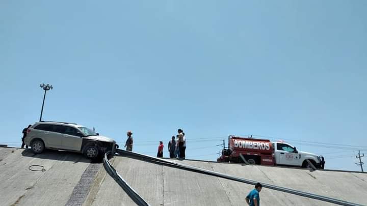 Hasta el sitio acudieron elementos de bomberos Morelos y Nava, quienes trataron de asegurar la unidsd que estaba entra la vaya perimetral a punto de caer al vacio.