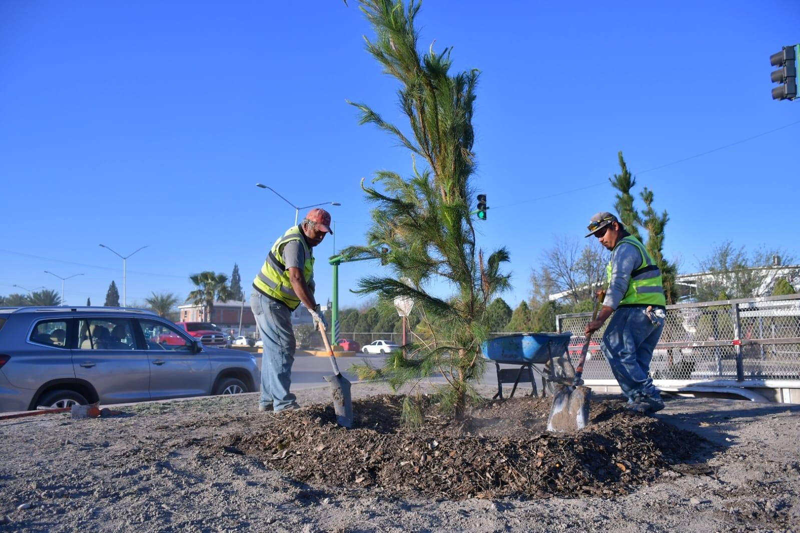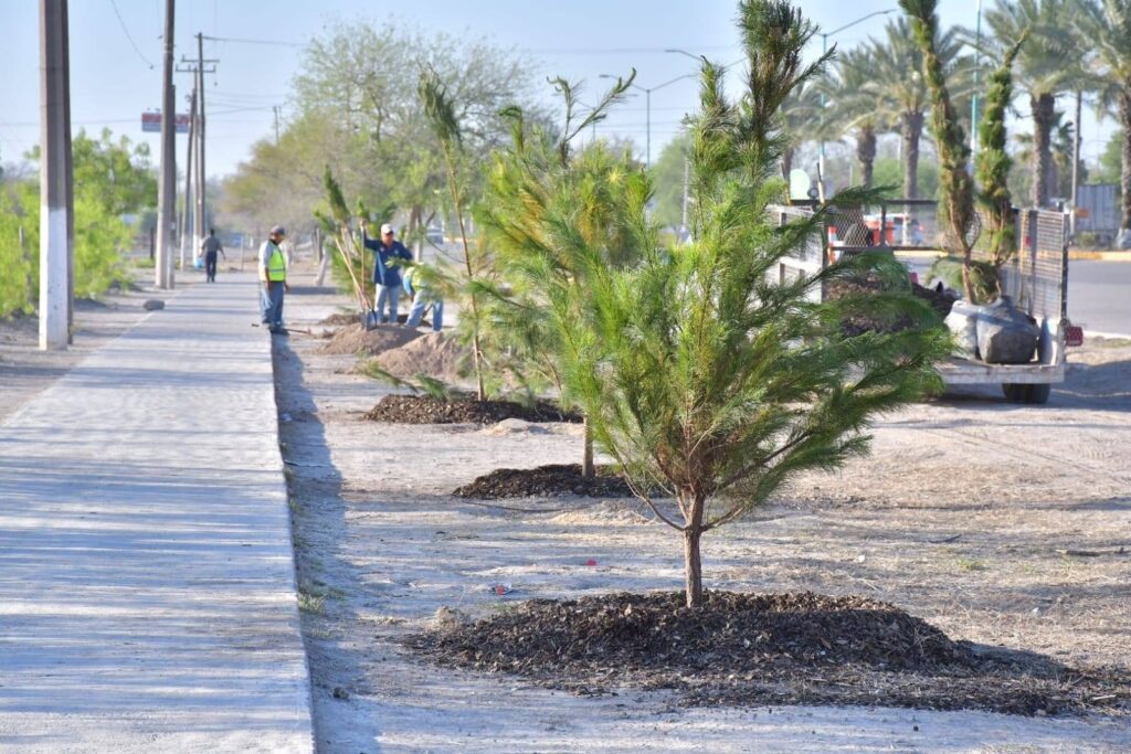 Nava, Coahuila.- Como parte de las acciones para mejorar el entorno urbano, se llevaron a cabo trabajos de reforestación en la entrada de la colonia Bosque y en la Plaza Bicentenario, donde se plantaron nuevos árboles para fortalecer las áreas verdes del municipio.