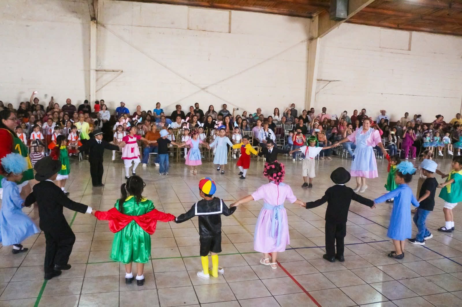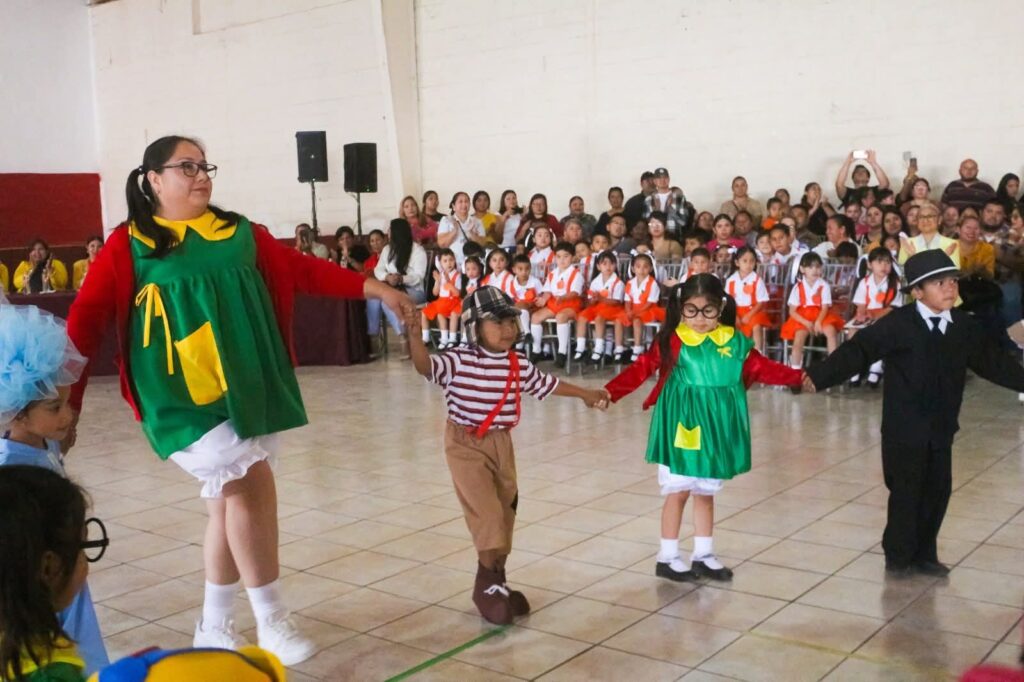 La jornada estuvo llena de color y entusiasmo, con niñas y niños interpretando rondas y dinámicas populares que evocaron recuerdos entre los asistentes, reflejando también el trabajo conjunto entre maestros y padres de familia.
