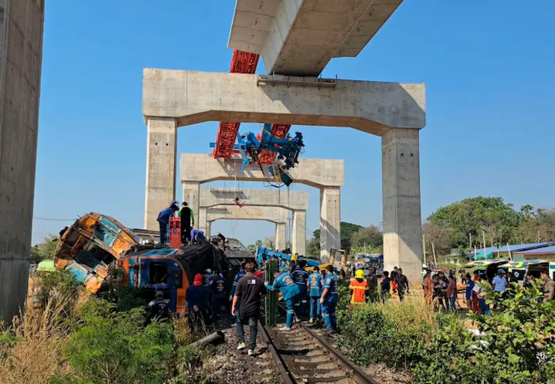 Una tragedia sacudió al noreste de Tailandia luego de que una grúa de construcción colapsara sobre un tren de pasajeros en plena marcha, provocando un descarrilamiento y un incendio que dejaron al menos 30 víctimas mortales y decenas de heridos.