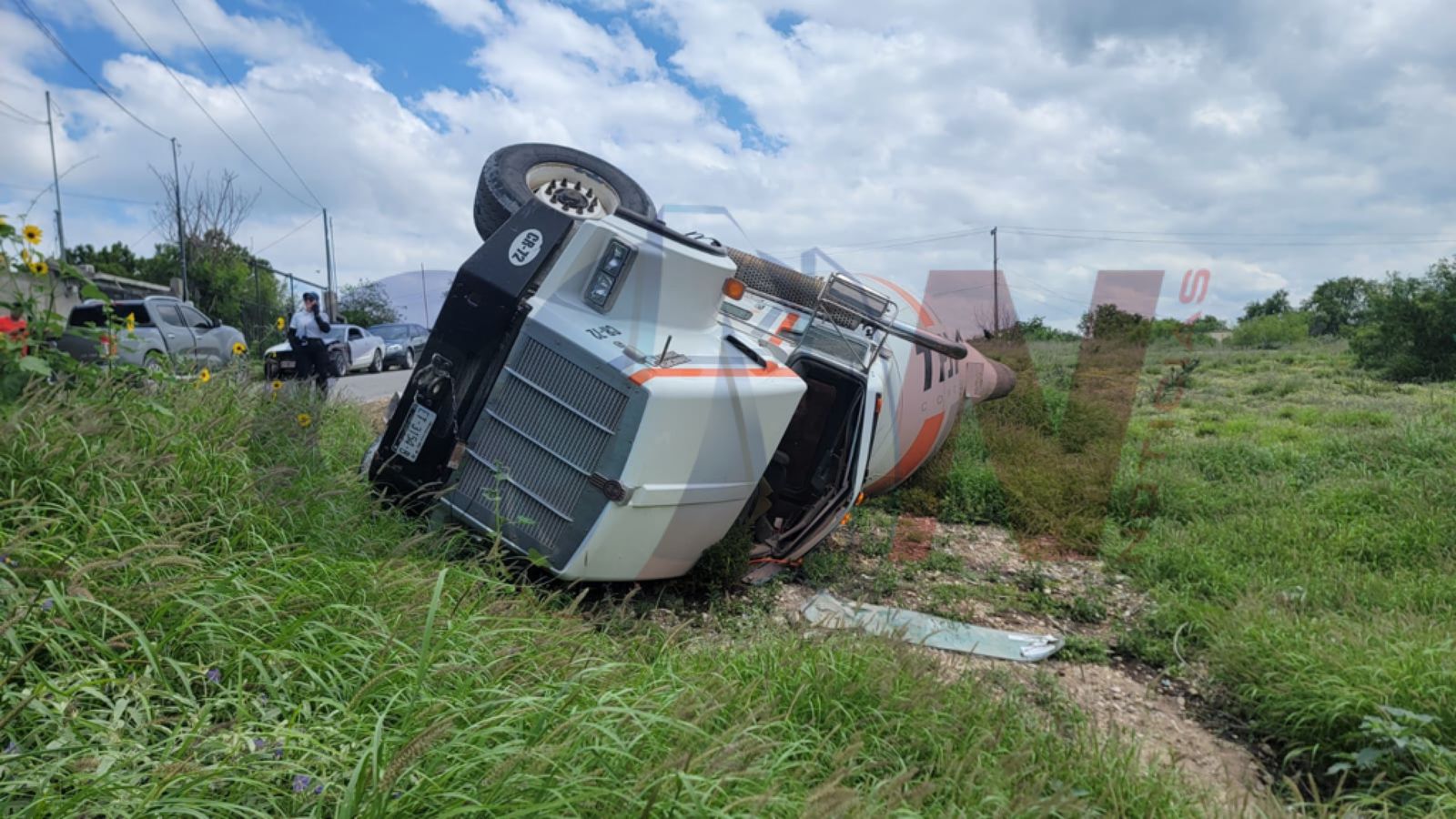 Julio Fernández | Piedras Negras, Coah.- Un camión revolvedor, propiedad de Triturados de Piedras Negras, terminó volcando sobre su costado al momento de provocar daños en una banqueta de la colonia Hidalgo.