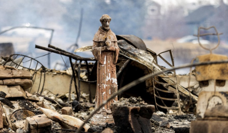 Por la noche las llamas tiñeron de naranja el cielo, con viento de hasta 160 km/h. Al parecer el incendio fue causado por la caída de postes eléctricos sobre un suelo árido; se propagó “en mosaico”, de modo que algunos barrios se salvaron mientras las casas de al lado se quemaron, explicó.