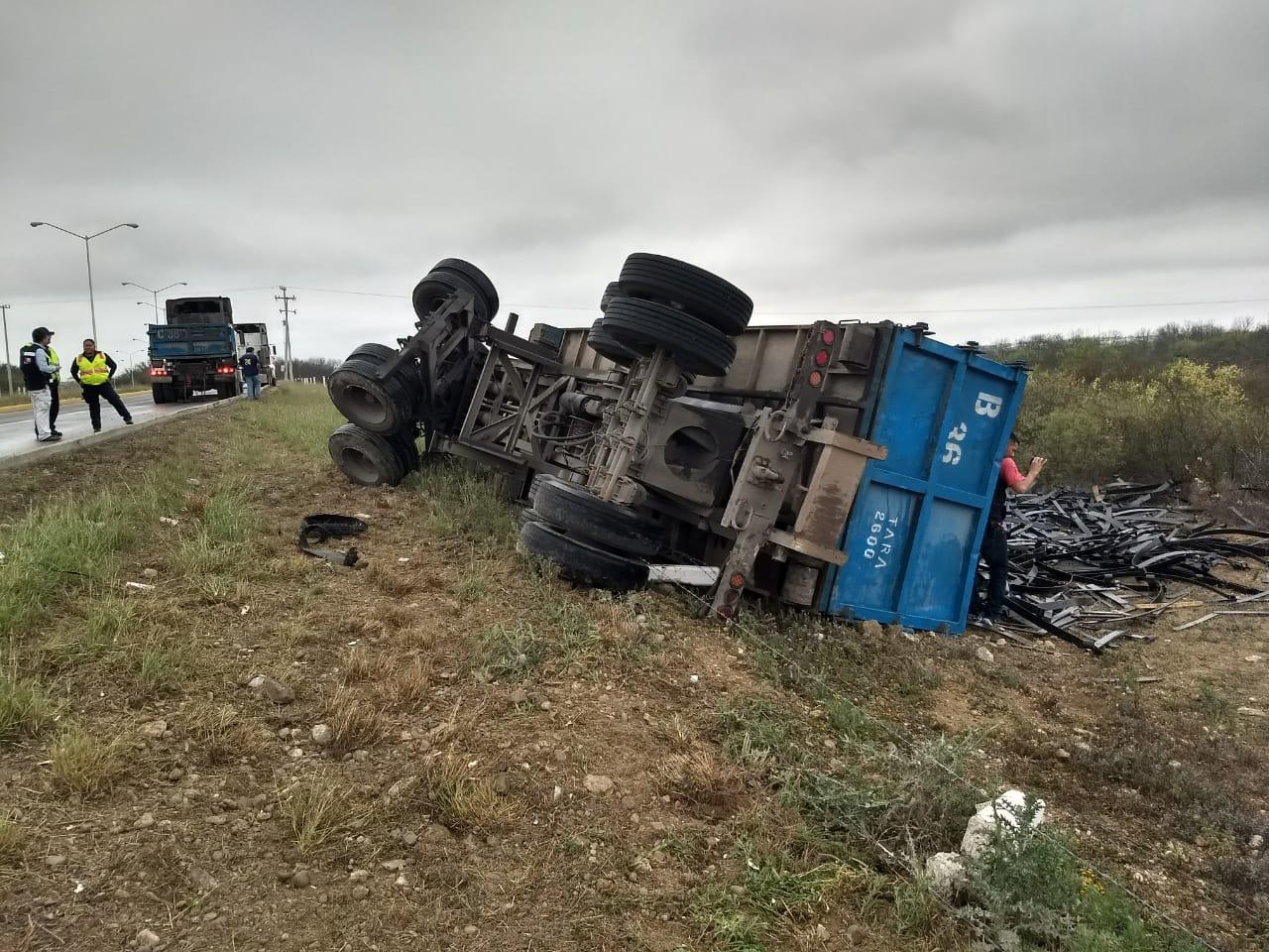 Julio Fernández | Piedras Negras.- Una caja de tráiler que transportaba 18 toneladas de muelles, terminó volcada sobre el Boulevard Centenario, a la altura de la colonia Presidentes, donde afortunadamente no hubo lesionados.