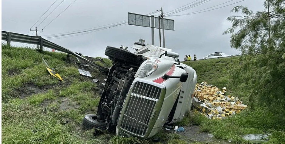 Agencias | Apodaca, Nuevo León.- Un tráiler volcó en una curva del paso a desnivel que conecta el Libramiento Noreste con la Carretera a Laredo, en el municipio de Apodaca, Nuevo León.